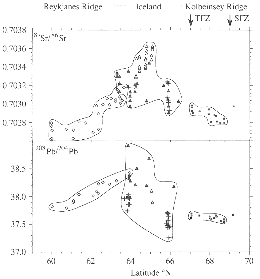1. IntroductionIceland, due to the interaction of a mantle plume with the midatlantic ridge, is a very interesting area for geodynamic studies. The presence of a mantle plume under Iceland is well known by geological, geodynamic (Ito et al., 1999) and geochemical (Mertz et al., 1991) investigations. The plume is assumed to have a broad plumehead but despite of recent seismological studies (Wolfe et al., 1997, Bijwaard and Spakman, 1999) the detailed structure of the Iceland Plume is not known. The V-shaped structure of the Reykjanes Ridge is explained either by higher mantle temperatures below or lateral flow of plume material along the ridge axis (Albers and Christensen). An equal mode of plume-ridge interaction is not observed for the Kolbeinsey Ridge north of Iceland, which may be the influence of the Tjörnes Fracture Zone. |