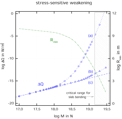 Also shown is the minimum slab bending curvature Rmin in dependence